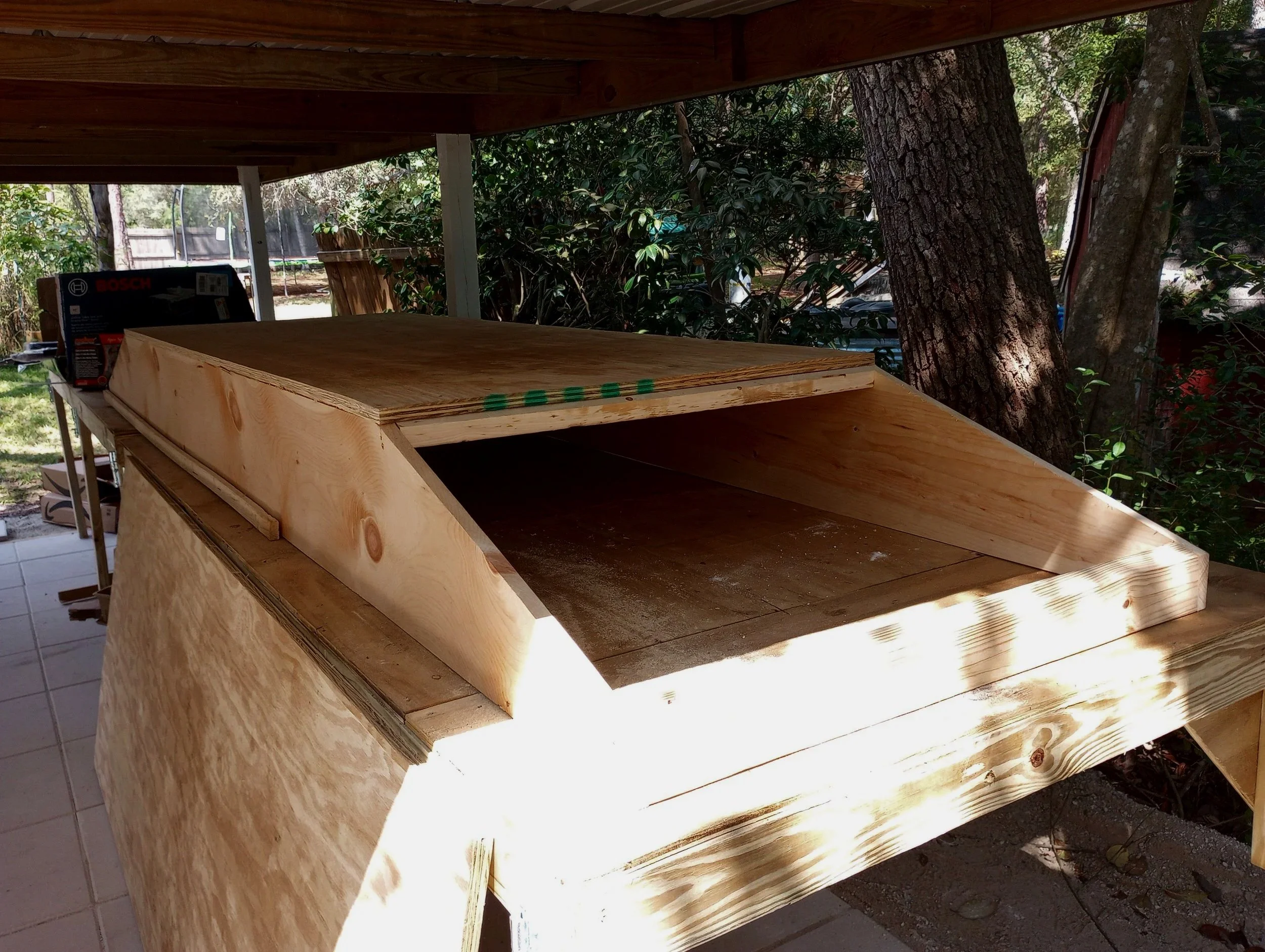 08-21-2025 - I pretty much completed the prototype today. I cut my two end sections, beveled them and attached them to both ends. I then had to flip it over to add a 1x2 to the top edges of the sides to stiffen them up. That’s was a chore to do by one’s self. I got it most of the way. I got it down from the table, turned it around, got it back up onto the edge of the 3 ft high bench with the other end on the 2 ft high bench. That’s as far as I could get it, I had to call for reinforcements, my wife. She helped me earlier when I was cutting the end sections and now I needed her again to guide the end back onto the high bench.
